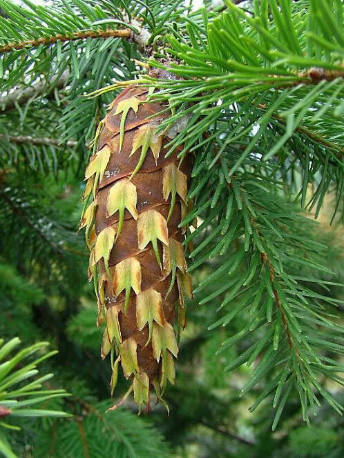 | Плоды | Шишки висячие, продолговато-яйцевидные, 5-10 см длиной, имеют характерные трехзубчатые кроющие чешуйки с вытянутой средней жилкой. |