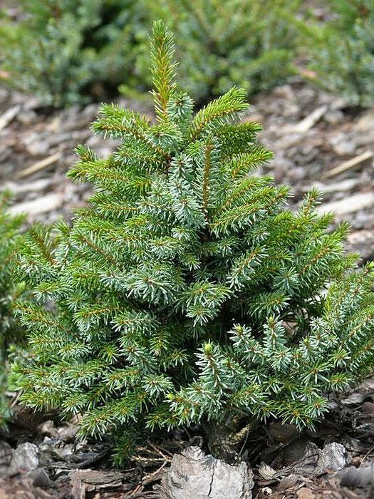 Ель сербская Нана (Picea omorika Nana) – Карликовая вид ели полученный в результате естественной мутации в 1930 г. Быстрорастущий. Годовой прирост в высоту – 35 см, в ширину - 15 см. Взрослое растение высотой 4,5 м, шириной 3 м. Крона стройная, плотная, правильной конической формы. Ветви густые, тонкие, плотные, короткие. Хвоя толстая, густая, блестящая, двухцветная. Сверху –зеленая, снизу – бело-голубая. Шишки коричневого цвета, длиной до 6 см. Ель Нана светолюбива, но может расти и на затененных участках. К качеству почвы не требовательна, но предпочитает рыхлые известковые. Плохо реагирует на уплотненные грунты и заболачивание. В засушливый сезон нуждается в поливе и дождевании. Рекомендуется для посадки в одиночных композициях, альпинариях, групповых композициях, контейнерах. Используется как живая изгородь. Хорошо реагирует на стрижку.