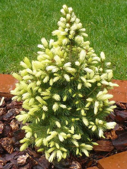 Ель сизая Дейзис Уайт (Picea glauca Daisy’s White) – Молодой сорт канадской ели, полученный в ходе мутации Conica в 1996 г. в Бельгии. Морозостойкий. Медленнорастущий. В год наращивает около 3-4 см прироста. Взрослое растение достигает диаметра в 1 м и высоты около 2 м. Крона молодого дерева растет неравномерно и выглядит разнобокой, с возрастом выравнивается и становится конической. Вершина – острая. Побеги тонкие, сильноветвящиеся, обильно покрыты иглами. Хвоя мягкая, тонкая. Декоративной особенностью сорта является контрастная соломенно-белая окраска молодых побегов, которые со временем становятся ярко-зелеными. Ель светолюбива, выносит полутень. Нуждается в защите от яркого весеннего солнца. Почвы предпочитает дренированные, рыхлые, легкие, влажные, в меру питательные. Рекомендуется сажать в качестве солитера на газоны, в роли декоративного элемента на альпийских горках. Хорошо смотрится в композициях и небольших садиках.
