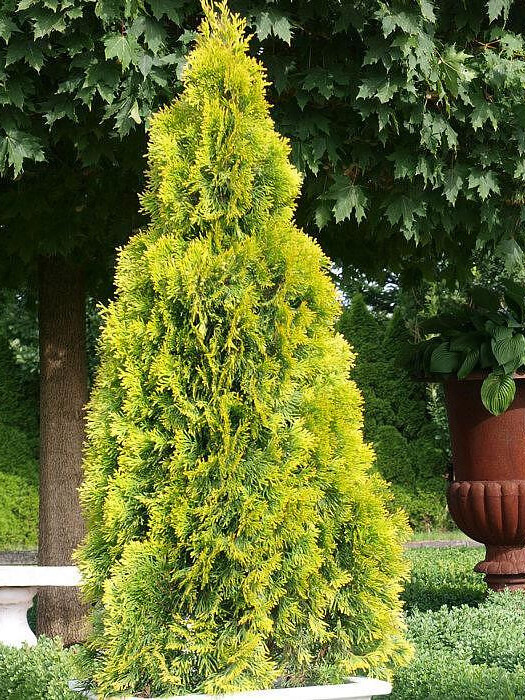 Туя западная Голден Смарагд, синоним: Джанед Голд (Janed Gold) - лучшая золотистая форма от популярного сорта Smaragd. Хвоя золотисто-жёлтая в течение всего года, крона почти идеальная коническая, к 10-ти годам высота 2 м.