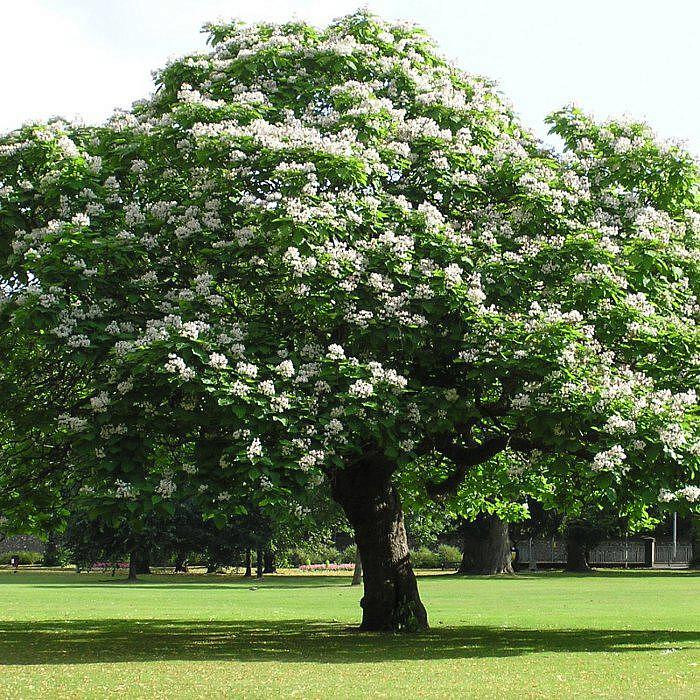 | Цветение | Первое цветение начинается с 5 года жизни. Цветет в июле. Соцветия пирамидальные, как у конского каштана до 25 см длинной. Цветки крупные, белые, с желтыми и коричневыми отметинами внутри. |