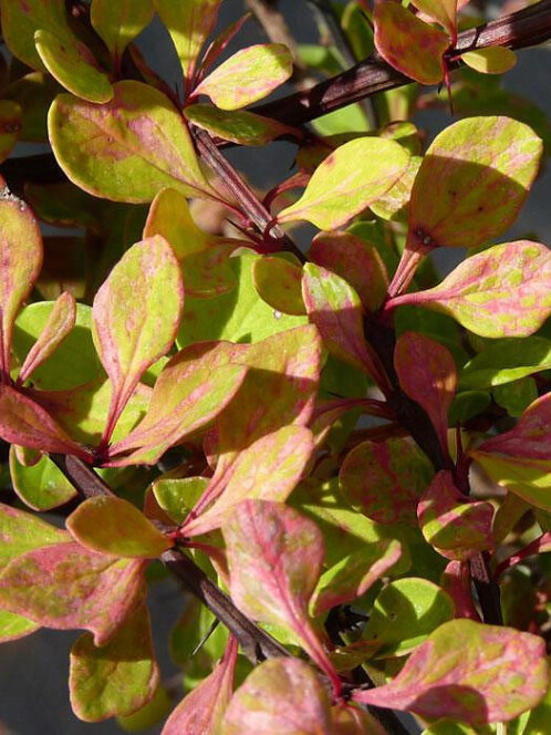 Декоративный лиственный кустарник высотой до 1 м. Новый, эксклюзивный сорт барбариса с распростертой формой кроны. Удивляет тем, что листья несколько раз меняют окраску в течение сезона. К середине лета сорт приобретает максимальную декоративность, окраска состоит из комбинации кремового, ярко-зеленого и темно-розового (практически карминового) цветов.