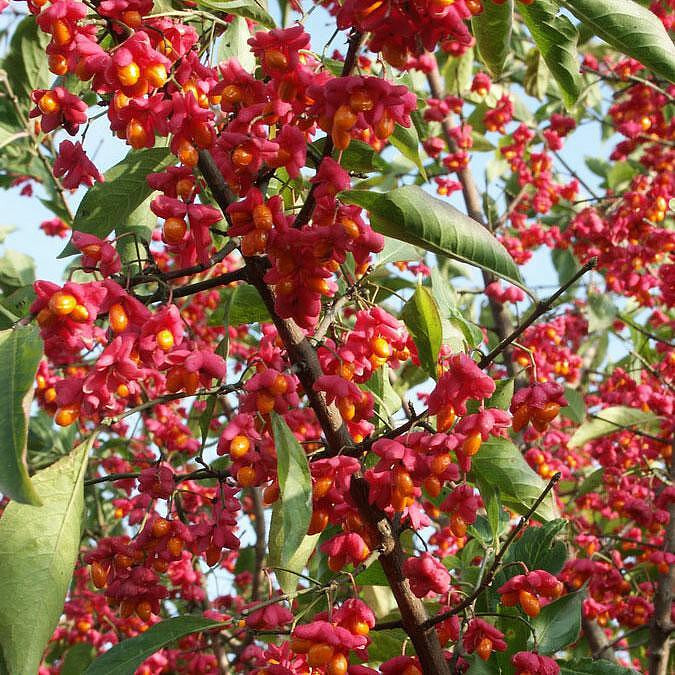 | Плоды | Плод бересклета - это сухая, кожистая, обычно четырехраздельная коробочка красно-оранжевых тонов. |