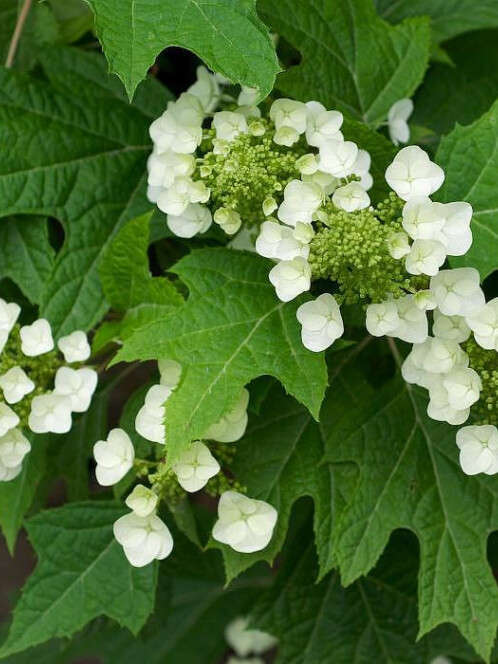 Гортензия дуболистная (Hydrangea quercifolia) - Куст до 2 м высотой, листья пятилопастные, внешне напоминают листья дуба, осенью приобретают темно-пурпуровую окраску. Цветки плодущие и стерильные, белые, собраны в метелки 10 см длиной, распускаются в июне–июле. Используется для одиночных посадок на газоне, у площадок для отдыха, создания красивых древесно-кустарниковых и смешанных с многолетниками групп.