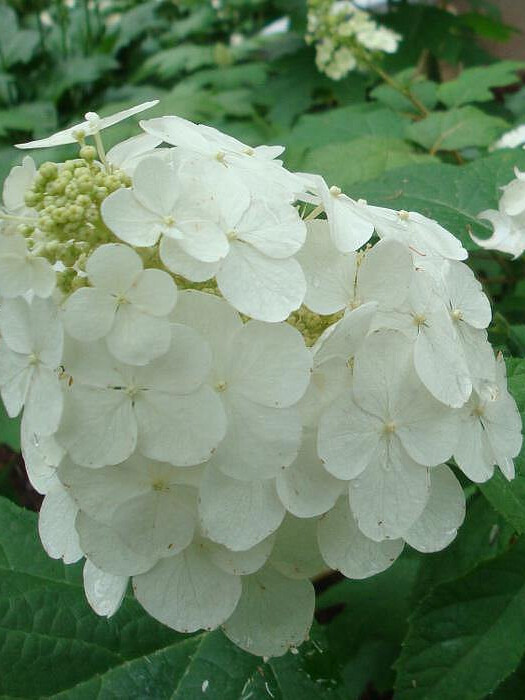 Гортензия дуболистная Сноу Квин (Hydrangea quercifolia Snow Queen) - Куст до 2 м высотой. Листья пятилопастные, внешне напоминают листья дуба, осенью приобретают темно-пурпуровую окраску. Цветки плодущие и стерильные, белые, собраны в метелки около 10 см длиной, распускаются в июне–июле. Используется для одиночных посадок на газоне, у площадок для отдыха, создания красивых древесно-кустарниковых и смешанных с многолетниками групп.