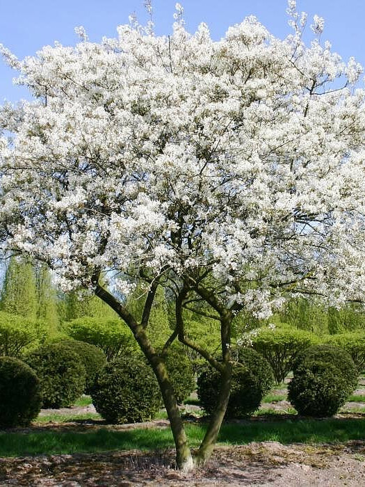 Ирга Ламарка (Amelanchier lamarckii) это лиственное дерево. Листья розоватые, затем сизо-зеленые, осенью оранжевые, красные, пурпурные. Цветы белые, плоды черные.