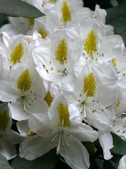Рододендрон Мадам Массон - вечнозеленый кустарник, цветет в мае-июне белыми цветами, внутри с желтой серединой, собранными в крупные соцветия.