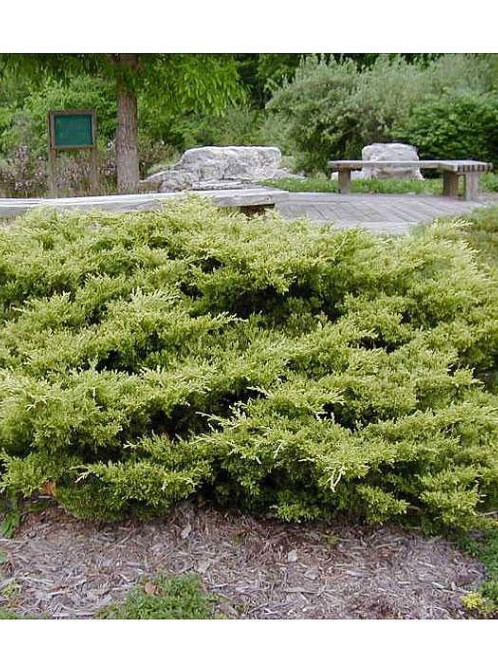 Широкий хвойный кустарник с поднятыми вверх ветвями, летом кончики ветвей становятся золотисто-желтыми, зимой хвоя голубеет. Гибрид Можжевельника казацкого и китайского. Систематика не определена окончательно - различные каталоги относят его к разным группам. Хорошо переносит условия города.