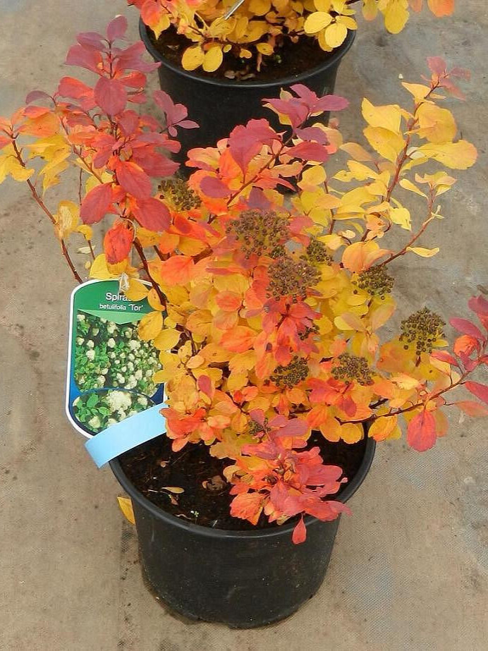 Спирея березолистная Тор - Красивоцветущий листопадный кустарник высотой до 1,0-1,5 м и диаметром кроны до 1,5-1,8 м. Осенью листва окрашивается в яркие желтые тона.