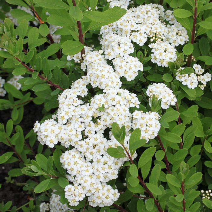 | Цветение | Цветки белоснежные, цветёт в мае-июне, очень обильно. Цветки собранными в крупные, выпуклые, щитковидные соцветия. |