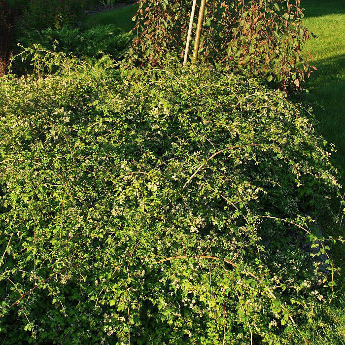 Стефанандра надрезаннолистная Криспа. Карликовый кустарник с распростертыми, стелющимися по земле побегами 0, 5 м высотой. Листья светло-зеленые, осенью желтые или оранжевые. Цветет в июне-июле. Цветки бело-зеленые, в кистях, с приятным запахом. Ценное почвопокровное растение.