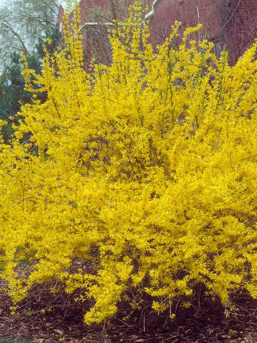 Форзиция средняя (синоним - Форзиция или Форсайтия промежуточная) - раскидистый кустарник с живописно свисающими боковыми побегами.