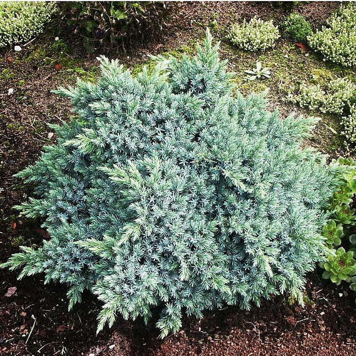 Карликовый хвойный кустарник высотой и диаметром 0,5 м с компактной кроной в форме подушки. Короткая хвоя синего цвета очень декоративна, расположение хвоинок напоминает узор инея или голубые звездочки.